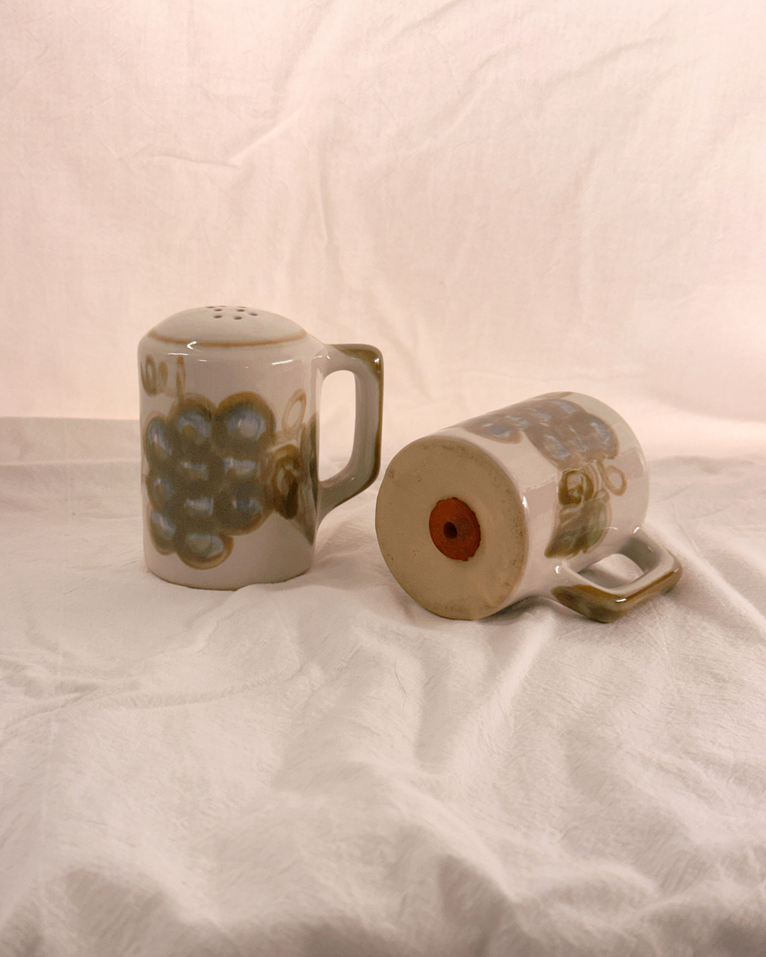Hand-painted with blue and purple grapes, this vintage ceramic shaker set adds rustic charm to everyday dining. Weathered handles and vine details bring a timeless, farmhouse feel—perfect for both daily use and display in your kitchen.